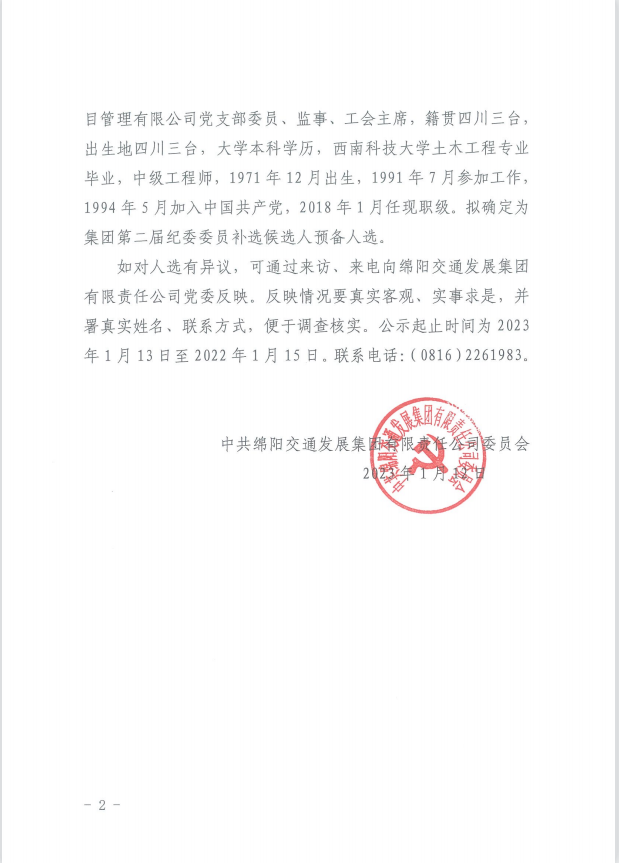 中拱綿陽(yáng)交通發(fā)展集團(tuán)有限責(zé)任公司委員會(huì)<關(guān)于進(jìn)行集團(tuán)第二屆紀(jì)委委員補(bǔ)選候選人預(yù)備人選公示的通知>